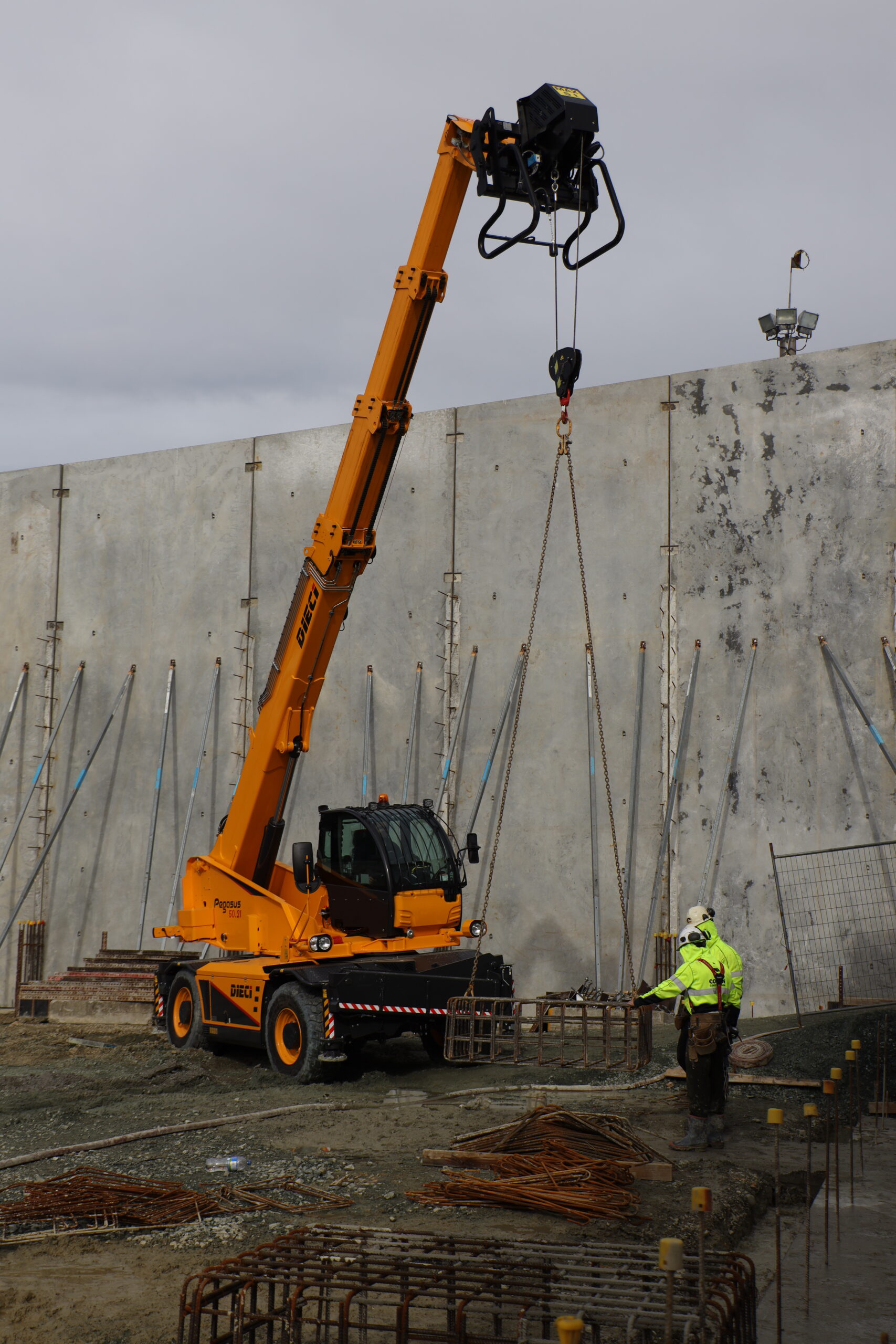 The Pegasus 50.21 telehandler, fitted with a lifting winch has the lift capabilities and reach to be able to safely lift these prefabricated concrete slabs into place, from a single stationary point.